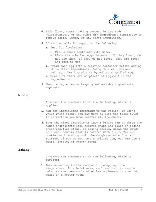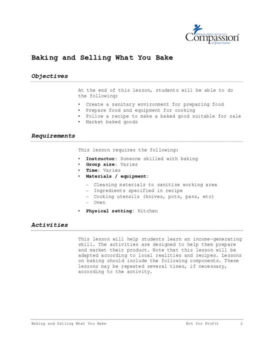This curriculum aims to equip adolescent students with life skills that may lead to income generation. This lessons focus on creating a sanitary environment for preparing food, prepping the equipment and ingredients for cooking, following a recipe to produce goods suitable for sale, and marketing the finished products Note that this lesson can be adapted according to local realities and recipes may be repeated several times, if necessary.