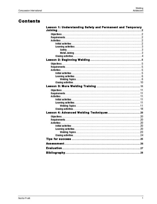 This collection of four lessons aims to equip adolescent students with life skills that may lead to income generation. Each lesson includes objectives, requirements, and various learning activities. Topics include understanding safety, beginning welding, welding training, and welding techniques. Lessons are 45 minutes and contain plans with specific instructions to help guide learning. The curriculum also includes tips for instructors and assessment and evaluation tools.