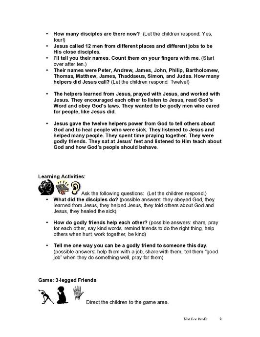 The lesson “Jesus Chooses His Disciples” teaches children about how Jesus chose 12 men to be His disciples based on their Godly character. The children will count the disciples together and identify some of the things each of them did in the Bible stories. Each child will name one or more ways he or she can be a Godly friend or person, just as the disciples were. The lesson includes guided instructions for the teacher, including preparation, a script, and suggested activities to facilitate further learning in a fun and interactive manner. This lesson is designed for children between 3-5 years, and is the 29th lesson in the 1st Year Core Curriculum Set and part of the “New Testament” unit.